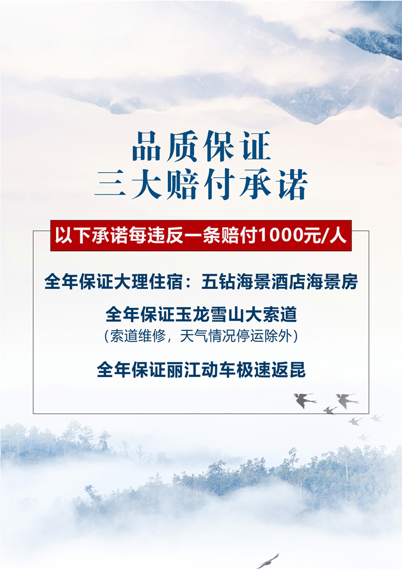 1.住宿:指定甄選攜程網好評5鑽酒店(diàn)(隻限昆大(dà)麗(lì)段)(大(dà)理(lǐ)1晚5鑽海(hǎi)景度假酒店(diàn)海(hǎi)景房+楚雄1晚特色溫泉酒店(diàn)),不提供自然單間,産生單房差由客人(rén)自理(lǐ); 2.門票:行(xíng)程所列景點首道大(dà)門票; 3.用(yòng)餐:5早5正+餐包,正餐40/人(rén),特色餐50/人(rén),10人(rén)/桌,每桌10菜一湯; 4.用(yòng)車(chē):全程3年内2+1旅遊空調大(dà)巴,5年以上(shàng)專業(yè)司機駕駛; 5.導遊:五年以上(shàng)熱(rè)愛旅遊事業(yè)的(de)專職導遊,行(xíng)程作息由随團導遊根據具體情況安排; 6.購(gòu)物(wù):全程無購(gòu)物(wù)店(diàn); |