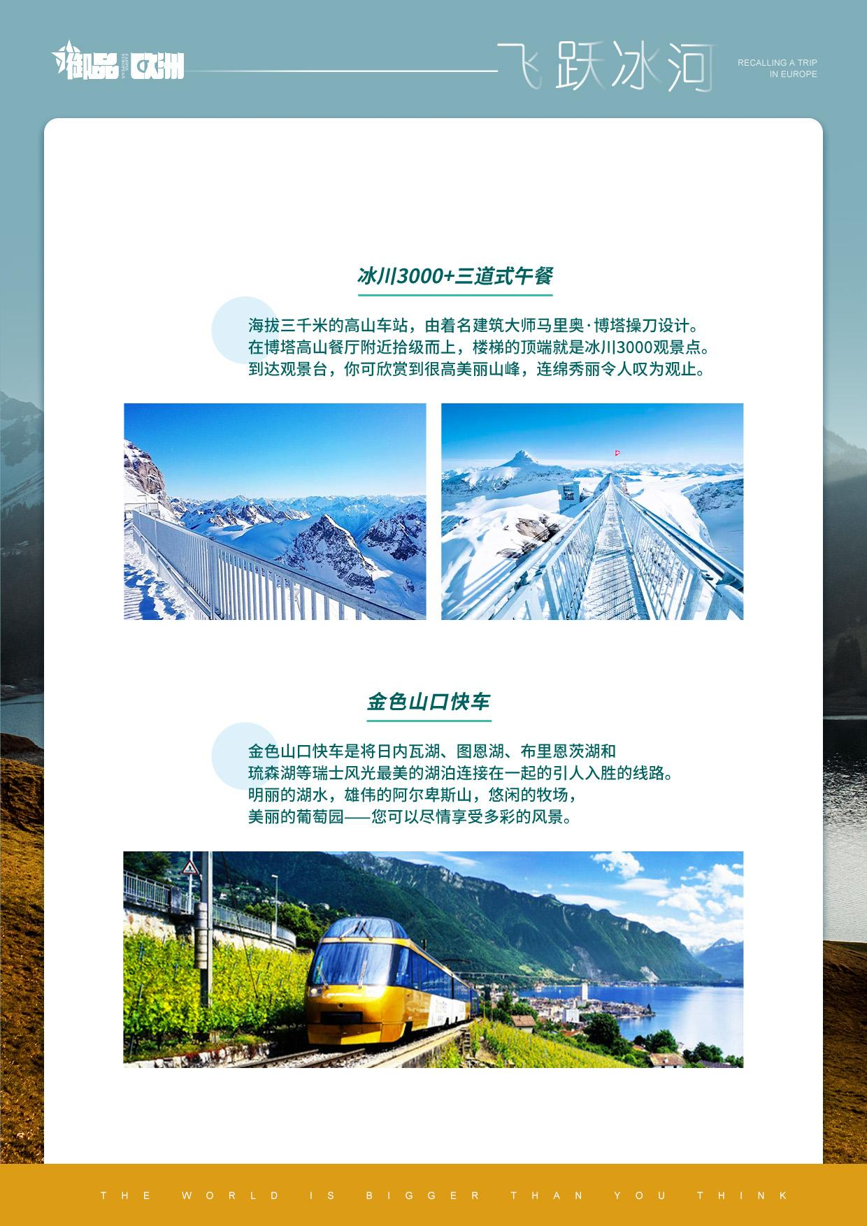 下午:★特别安排【金(jīn)色山口列車(chē)】(二等座) 途明(míng)麗(lì)的(de)湖水(shuǐ),雄偉的(de)阿爾卑斯山,悠閑的(de)牧場(chǎng),美(měi)麗(lì)的(de)葡萄園,