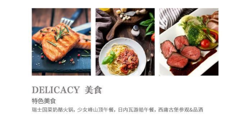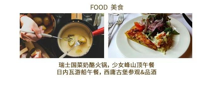 特色美(měi)食: 瑞士特色餐 : 瑞士獨具特色的(de) 奶酪火(huǒ)鍋,用(yòng)溶化的(de)純正瑞士奶酪制(zhì)作而成,等著(zhe)您去品嘗;