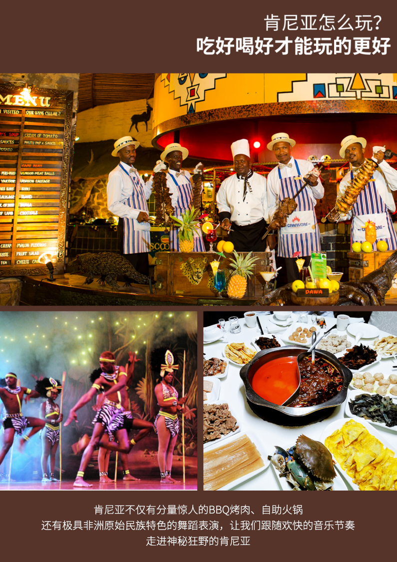 晚餐特别安排非洲著名的(de)“百獸宴”,與各國遊客享用(yòng)非洲特色烤肉餐,一飽口福!