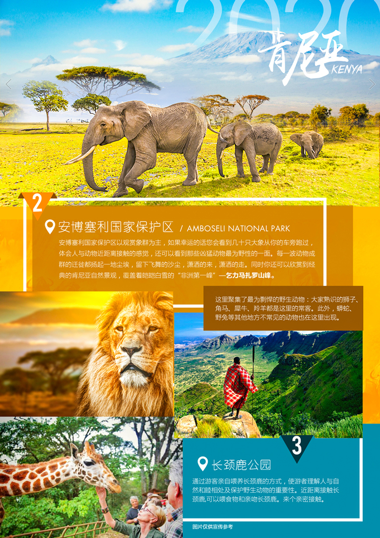 安博塞利國家保護區以觀賞象群爲主,如(rú)果幸運的(de)話(huà)您會(huì) 看到(dào)幾十隻大(dà)象從你(nǐ)的(de)車(chē)旁跑過,體會(huì)人(rén)與動物(wù)近距離(lí)接觸的(de)感覺,同時你(nǐ)還可(kě)以欣賞到(dào)經典的(de)肯尼亞自然景觀,覆蓋著(zhe)皚皚白雪(xuě)的(de)“非洲第一峰”—【乞力馬紮羅山峰】,結束遊覽返回酒店(diàn)休息。