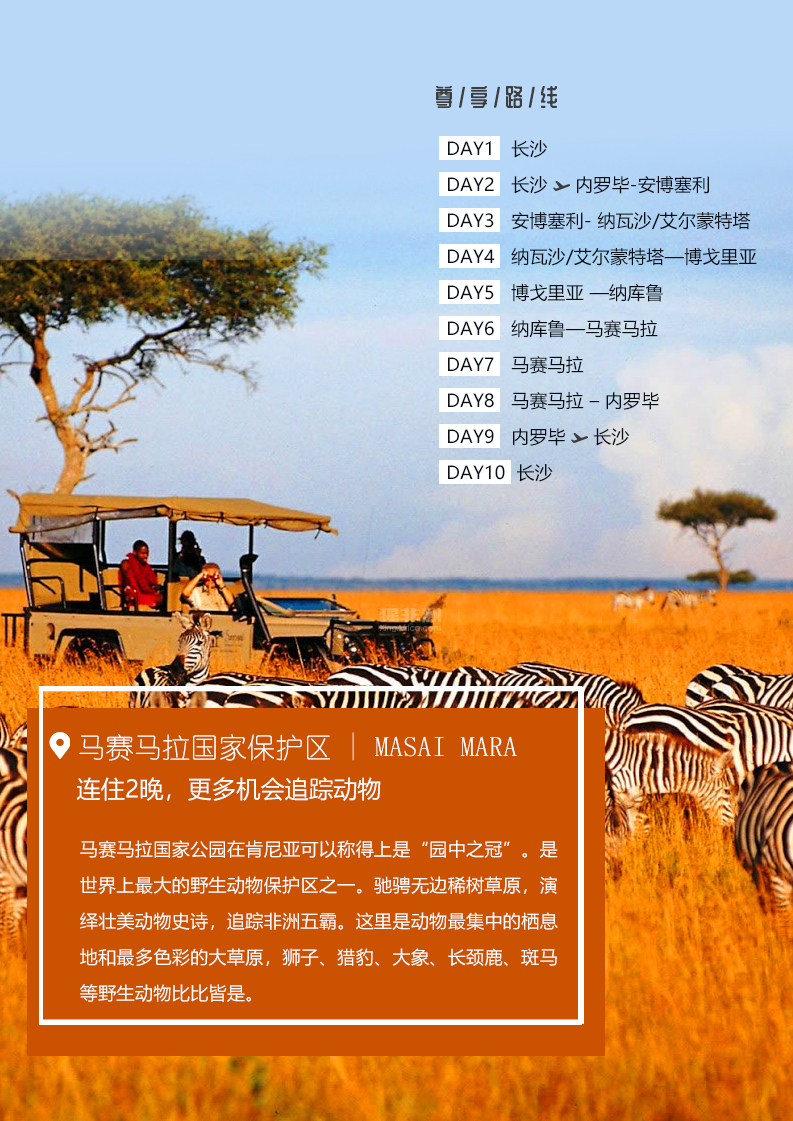 酒店(diàn)早餐後前往【馬拉河】,觀賞被譽爲“人(rén)生必需見證的(de)50個(gè)景觀”之一 —“動物(wù)大(dà)遷徙”。 7月(yuè)初至10月(yuè)底肯尼亞境内馬賽馬拉國家野生動物(wù)保護區上(shàng)演的(de)“馬拉河之渡”,數百萬計(jì)的(de)動物(wù)在狹小(xiǎo)的(de)馬拉河河口你(nǐ)推我擁,互相(xiàng)踐踏,那種壯觀,亦隻有(yǒu)在肯尼亞才能(néng)親身感受到(dào)(全天遊覽約7小(xiǎo)時,含午餐時間)。