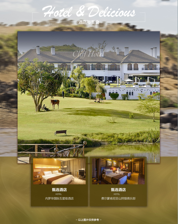 酒店(diàn)安排:内羅畢國際五星酒店(diàn)+費爾蒙德肯尼亞山狩獵俱樂(yuè)部或同級 +景區特色酒店(diàn)(如(rú)若出現酒店(diàn)無房,則調整爲