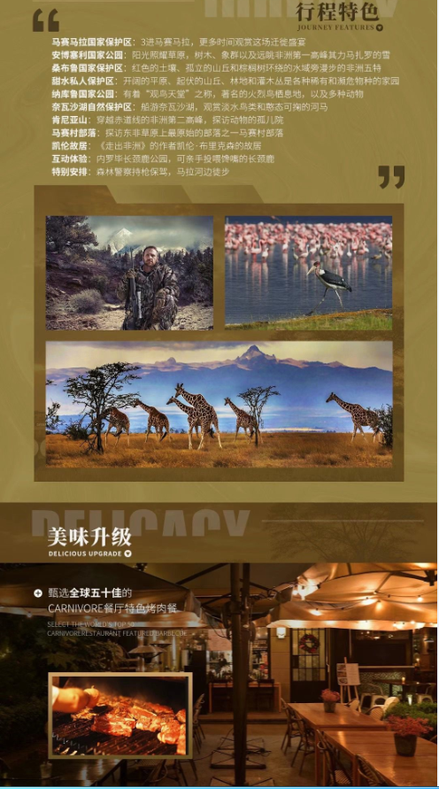 風味美(měi)食:内羅畢中餐+保護區特色酒店(diàn)内自助餐或當地(dì)餐(由于行(xíng)程原因,部分(fēn)打包餐食)