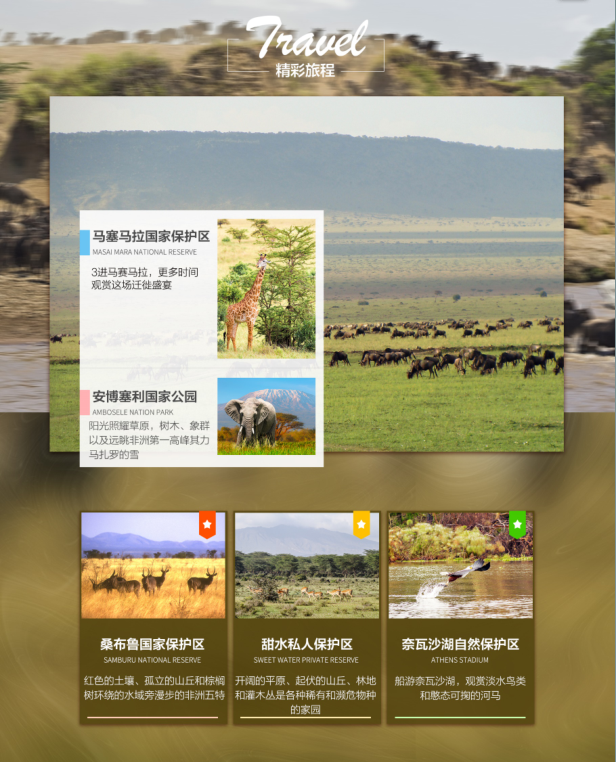 園、奈瓦沙湖、馬賽馬拉、甜水(shuǐ)動物(wù)保護區、肯尼亞山動物(wù)孤兒院、内羅畢長頸鹿公園,豐富、獨特的(de)旅行(xíng)體驗;馬