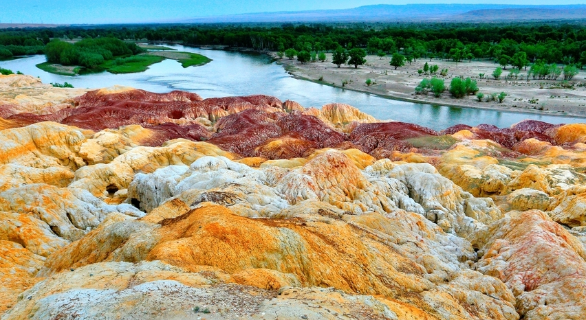 繼續向西(xī)奔流,彙入布爾津河。後前往著名的(de)“最美(měi)臨水(shuǐ)雅丹”【五彩灘】(含